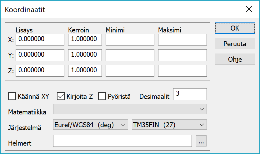 Kuvien koordinaatit ovat aina WGS84-koordinaatistossa ja ne pitää käytännössä aina muuttaa haluttuun järjestelmään muuntimen koordinaattiasetuksilla. Kuvista luetaan myös muut mahdolliset ominaisuudet kuten GPS moodi, DOP-arvo ja kuvanottoaika. Ominaisuudet riippuvat kuvan ottaneesta laitteesta.
