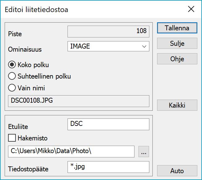 Auto-painikkeella voidaan kuvat lisätä automaattisesti vastaaville pisteille. Etuliite-asetukseen laitetaan kuvan nimestä poistettava etuliite (esim. IMG tai DSC). Loppuosasta muodostetaan pistenumero, jolla etsitään vastaava piste pääikkunasta. Jos piste löytyy, kuva lisätään pisteen liitetiedosto-ominaisuudeksi annetulla nimellä.