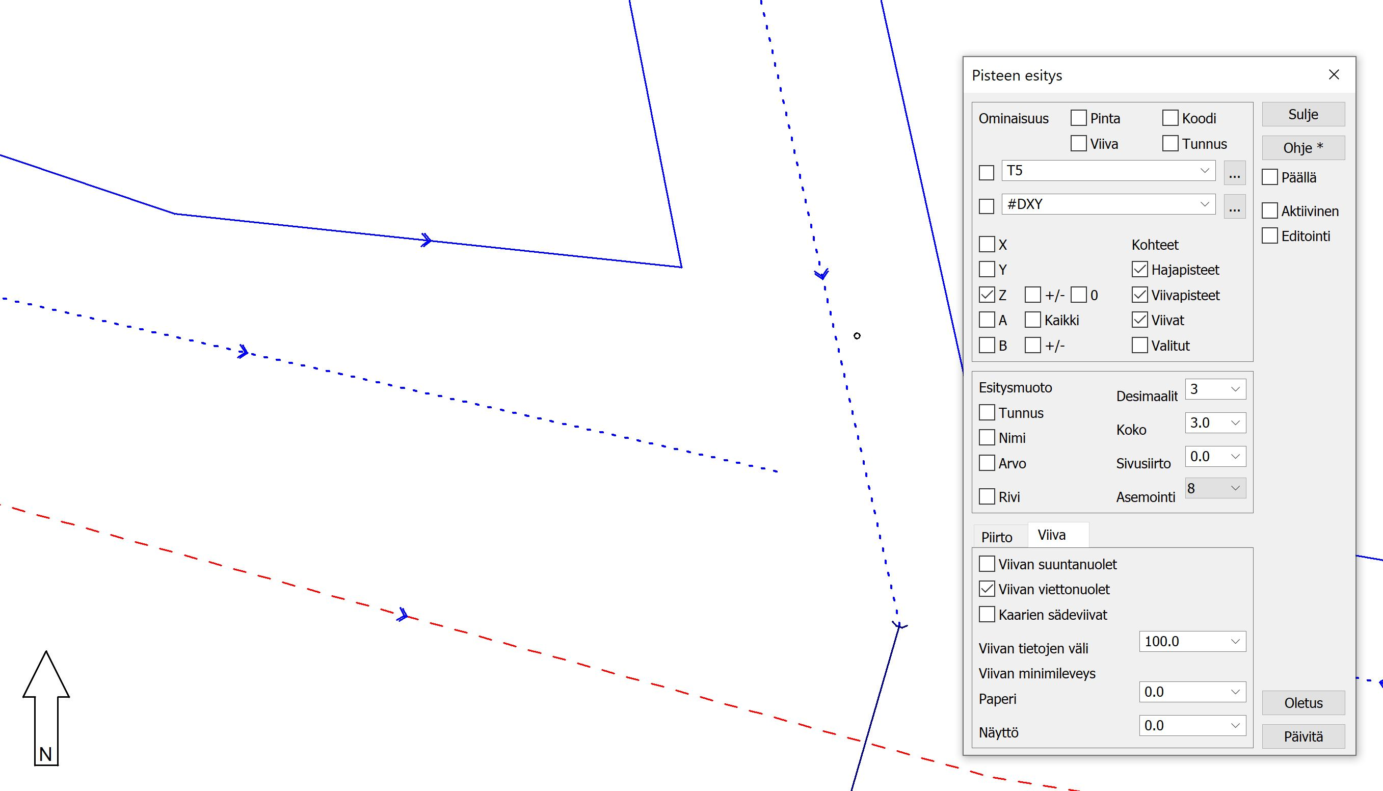 Taiteviivan viettosuunnan määrittämisessä riittää, että avaa Pisteen piirtoasetukset (Asetukset > Pisteen esitys) ja edelleen valikon alareunasta valitse välilehden Viiva > Viivan viettonuolet.