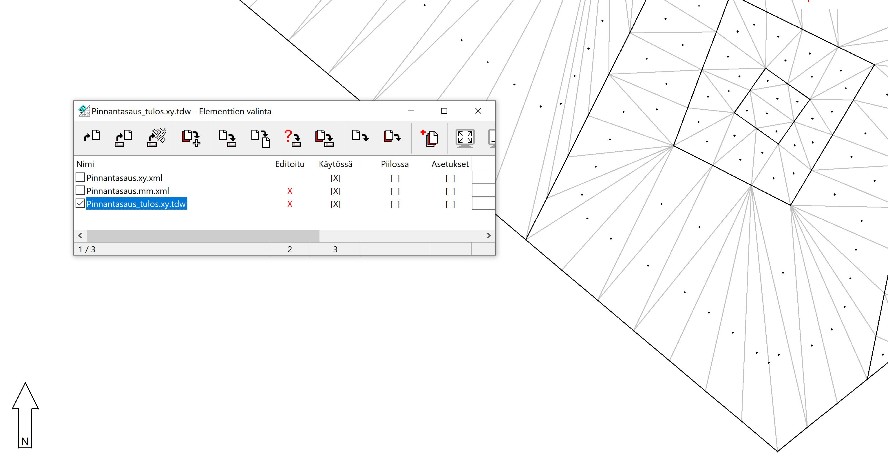 Toiminto toimii yksinkertaisuudessaan näin. Avataan haluttu maastomalli ohjelmistoon joko 3D-Winin omana mm-tiedostona, taikka sitten yleisemmin käytössä olevana LandXML-tiedostona. Seuraavaksi avataan Maastomalli > Aputoiminnot > Laske kolmioiden painopisteet. Voit tässä vaiheessa vielä määrittää kolmioiden pintaan, koodiin, pinta-alaan ja sivunpituuteen liittyvillä rajoituksilla tulevien painopisteiden syntyä. Kaikille kolmioille ei tarvitse siis samalla kertaa painopistettä laskea, vaan se on käyttäjän itsensä määritettävissä mitä kolmioita halutaan laskennassa käyttää.