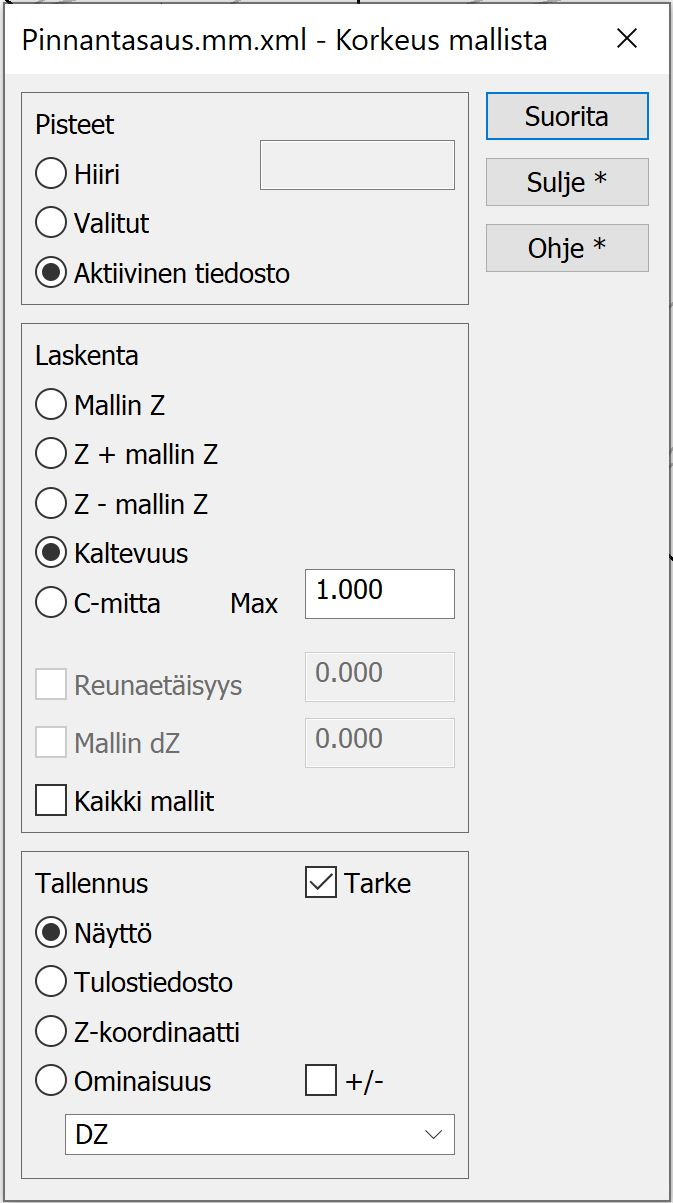 Seuraavaksi voidaan edetä tarke-/suuntanuolen piirtoon. Mennään valikkoon Maastomalli > Korkeus mallista. Valitaan käsiteltäväksi tiedostoksi "Aktiivinen", keskimmäisestä kohdasta valitsemme "Kaltevuuden", ja viimeisestä "Tallenna"-kohdasta voidaan valita kohta ”Näyttö”, ja ennen kaikkea valinta ”Tarke”. Mikäli tarke-kohdasta puuttuu valinta, ei ohjelmisto piirrä syntyviä suuntanuolia näytölle.