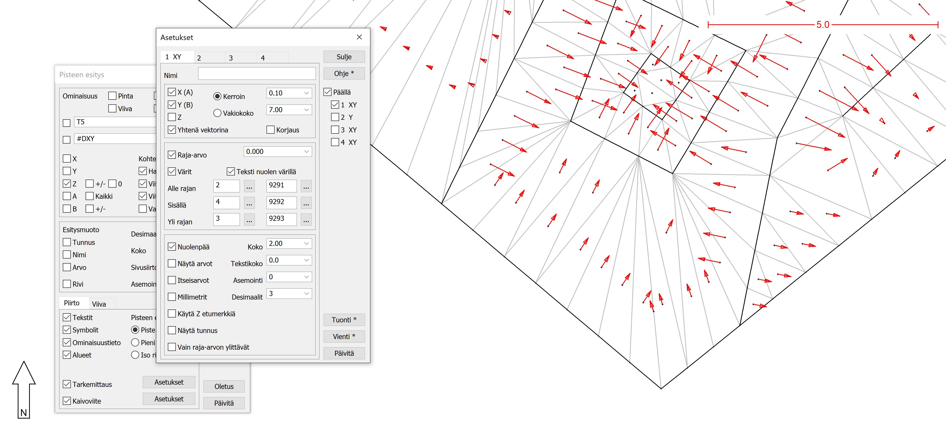 Suosittelemme tässä vaiheessa kuitenkin valitsemaan valikon ylälaidasta kohdat X (A) ja Y (B) aktiiviseksi, Z-korkeutta emme tarvitse, ja edelleen "Yhtenä vektorina" -kohta päälle. Nyt pitäisi nuolien piirtyä aina jokaisen yksittäisen kolmion alinta paikkaa kohti. Seuraavaksi voitte myös määrittää valikon ylälaidasta sen, haluatteko, että jokainen nuoli on samankokoinen (sekä myös nuolen pituuden), vai haluatteko määrittää nuolen piirron kertoimella. Mikäli käytämme valinnassamme kerrointa, piirtää se suuntanuolen suhteessa kyseisen kolmion pinnan kaltevuuteen. Mitä pidempi suuntanuolesta piirtyy, sitä enemmän kaato kyseisessä kolmiopinnassa on.