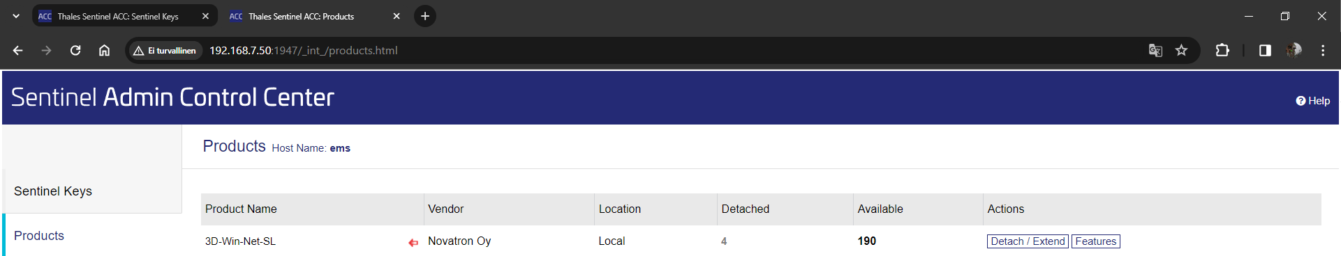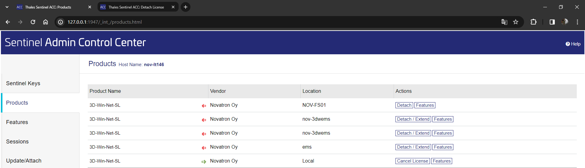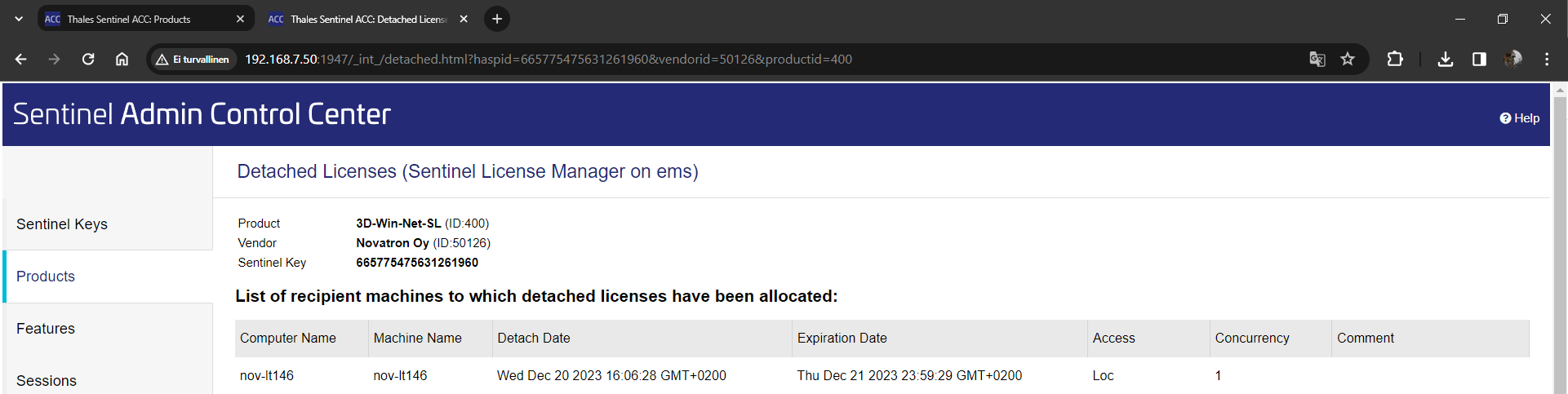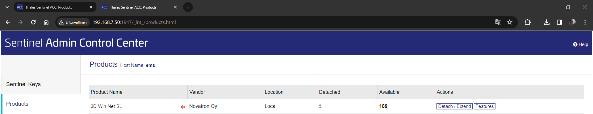 Lisenssin lainaaminen paikalliselle koneelle tapahtuu samasta (tarkista että olet paikallisen koneen ACC:lla) Products-kohdasta painamalla Detach/Extend -painiketta, mikäli se on sallittu lisenssipalvelimelta ja lisenssejä on vapaana lainaamista varten.
