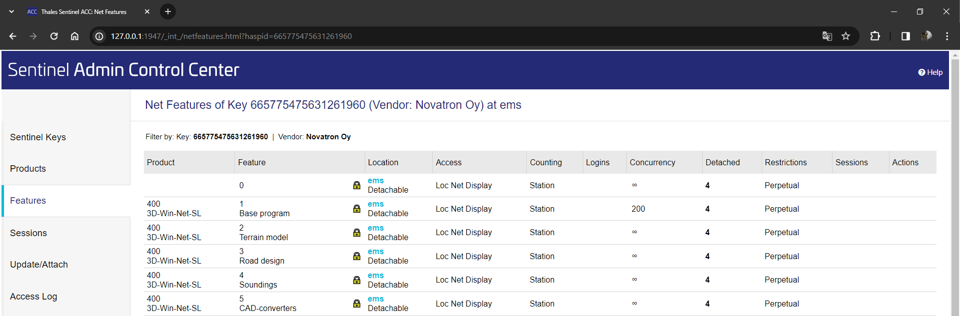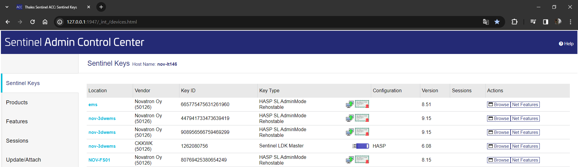 Listassa näkyy Vendor ID, joka on joko Novatron Oy tai 50126 3D-Win -ohjelmalla, Key Type on Sentinel HL Max ja kuvake