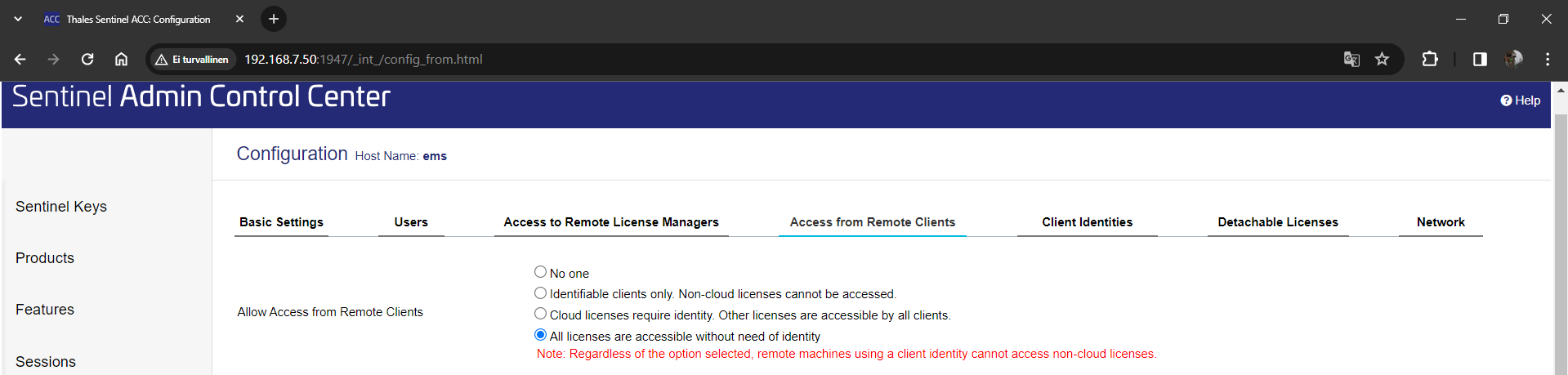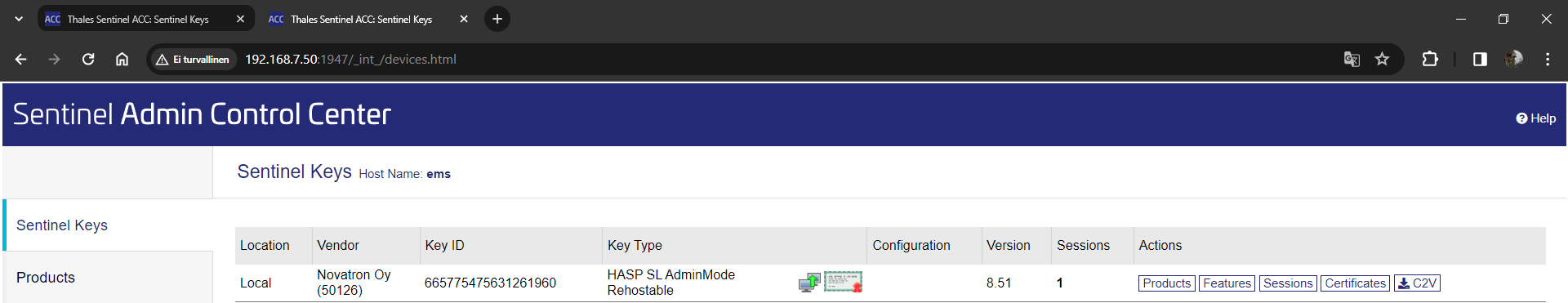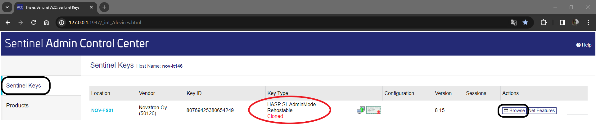Paina kloonautuneen lisenssin perässä olevaa Browse -painiketta, jolloin avataan uusi välilehti, joka vie sinut lisenssipalvelimelle. Jos lisenssit eivät näy listalla, paina vasemman laidan valikosta Sentinel Keys.