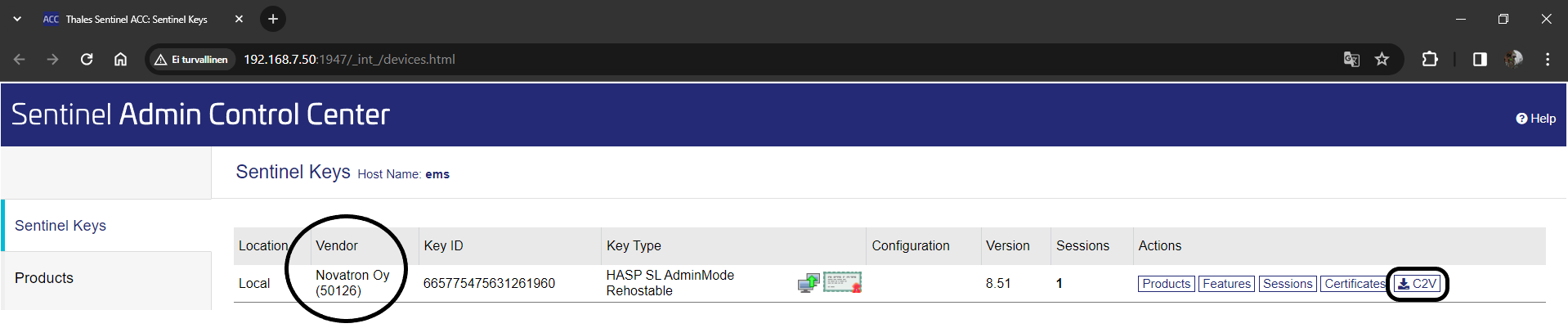 Siirryttyäsi palvelimelle paina lisenssimme perässä olevaa C2V-painiketta (Vendor kohdassa oltava joko Novatron Oy tai 50126) ja lähetä sillä tekemäsi C2V-tiedosto meille sähköpostilla.