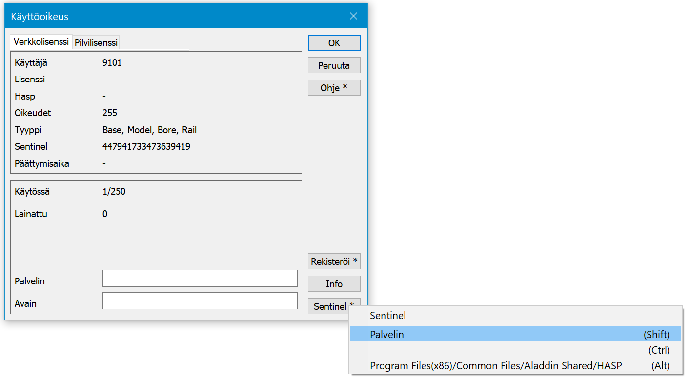 Sentinel-painikkeella pääsee tarkastelemaan lisenssipalvelimen tietoja tarkemmin selaimella. Hiiren kakkospainikkeella saat vaihtoehdot näkyviin.