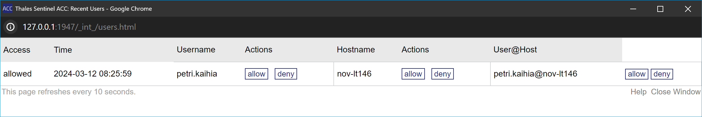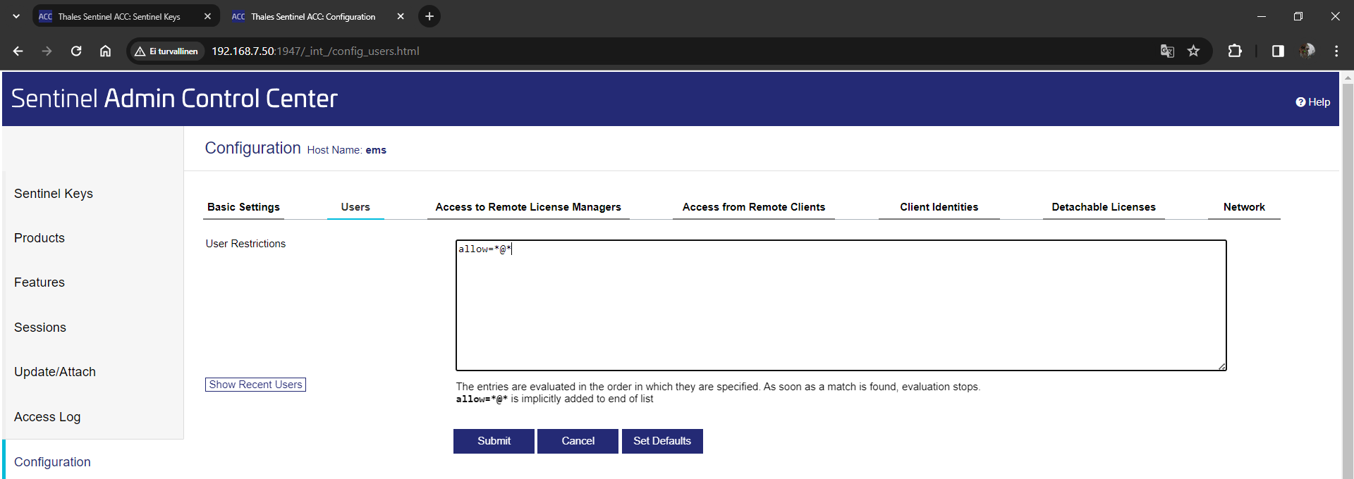 Välilehdellä on myös Show Recent Users -painike, jolla näkee lisenssipalvelimeen lähiaikoina kirjautuneet käyttäjät. Tästä avautuvasta ikkunasta voi helposti sallia tai estää sinne kirjautuneen käyttäjän jatkossa. Muutokset tulee vahvistaa Configuration-välilehdellä Submit-painikkeella.
