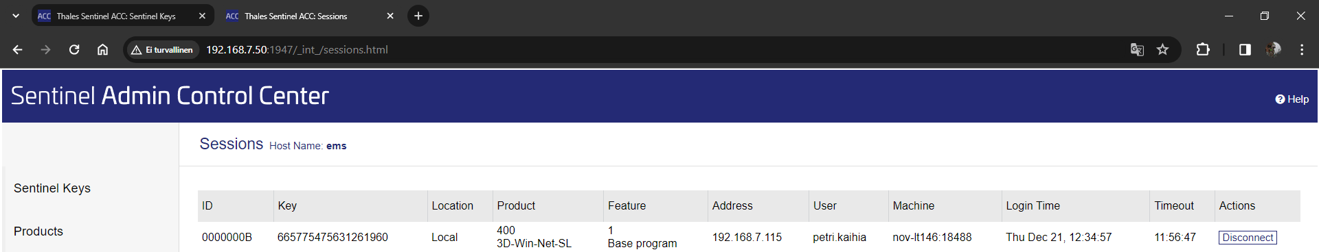 Sessions-painikkeella näet ketkä ovat lisenssin käyttäjiä parhaillaan (IP-osoite, käyttäjän nimi ja koneen nimi).