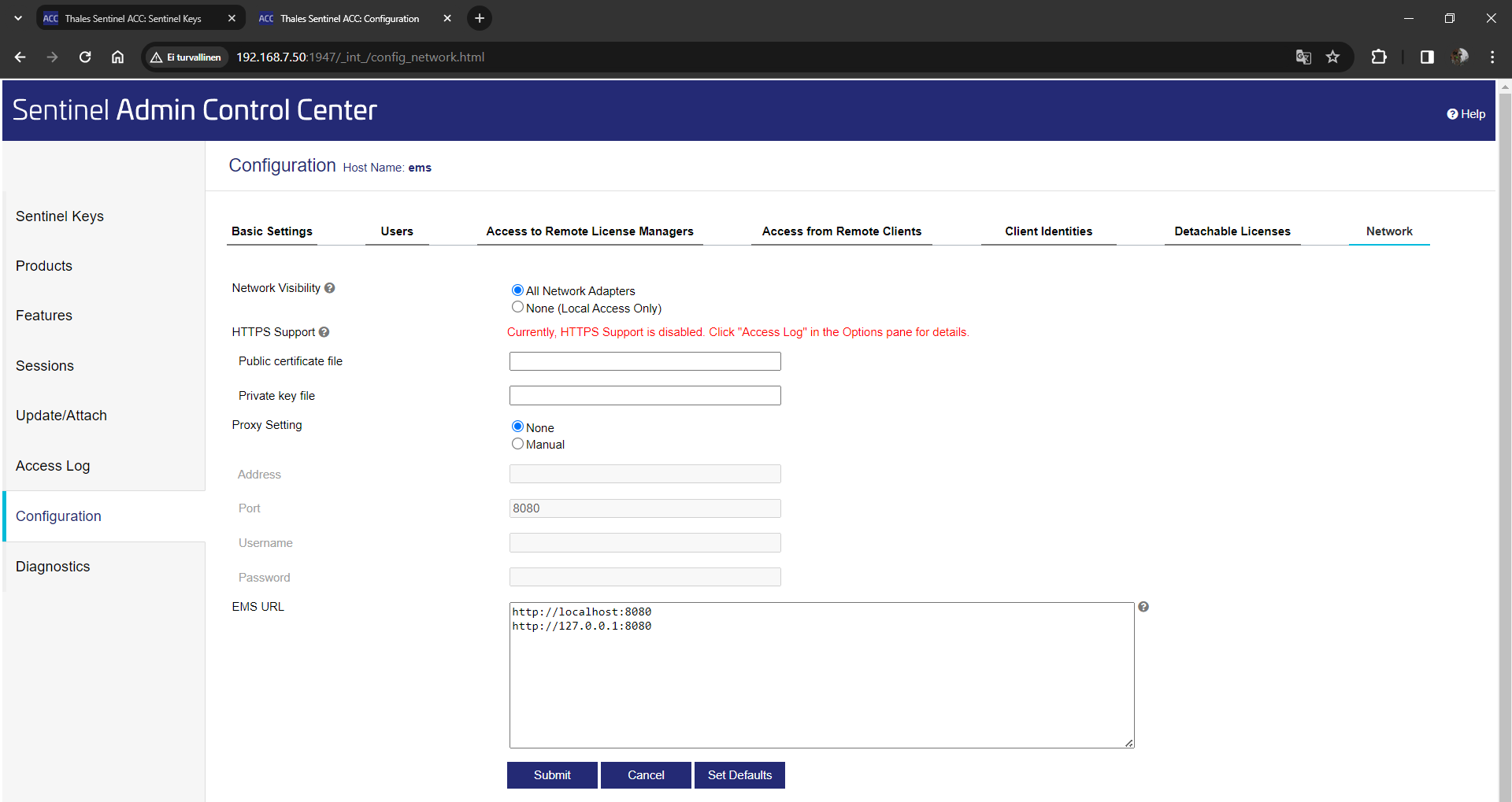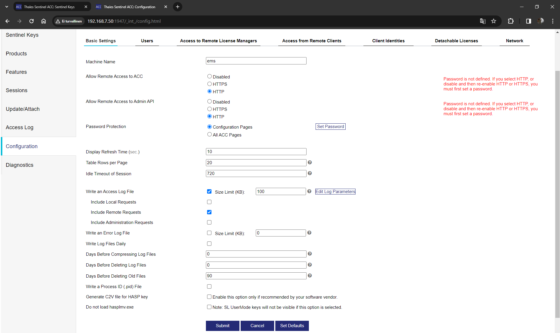 6. Valitse ACC:n Configuration-kohdasta välilehti Access from Remote Clients ja rastita Allow Access. Vahvista Submit-painikkeella.