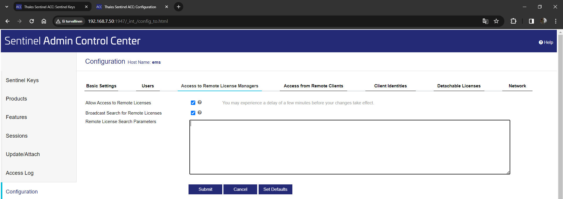 Access from Remote Clients -välilehdellä määritetään mistä IP-osoitteista pääsee käyttämään lisenssejä. Palvelimen ACC:lla tulee ruksata vähintään Allow access from remote clients ja vahvistaa se Submit-painikkeella. Katso myös Network-välilehden asetus!