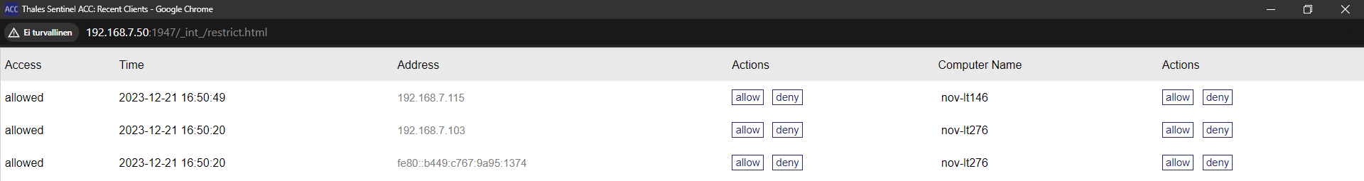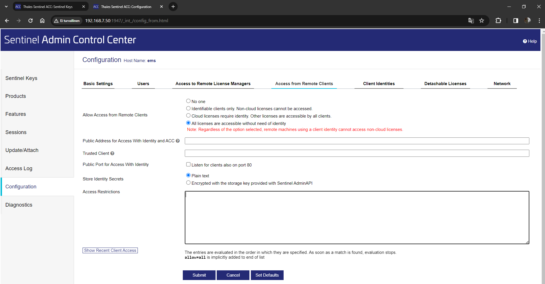 Access Restrictions kohtaan voi määrittää listan IP-osoitteita, joilla on pääsy (allow=) lisenssipalvelimelle tai joiden pääsy on estetty (deny=). IP-osoitteet voi antaa yksittäisinä 12.233.45.45, osoitevälinä 12.233.45.10-58 tai korvaamalla tähdellä yhden tai useamman tason osoitteesta 12.233.. Show recent Client Access painikkeella näkee viimeaikaiset kirjautumiset. Tästä ikkunasta voidaan sallia tai kieltää kyseinen IP-osoite. Muutos tulee vielä vahvistaa Configuration-välilehdellä Submit-painikkeella.