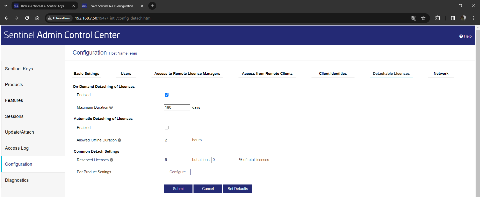 Detachable Licenses -välilehdellä määritetään, onko SL-lisenssistä lainattavissa määräajaksi lisenssejä työasemille valitsemalla Enable detaching.