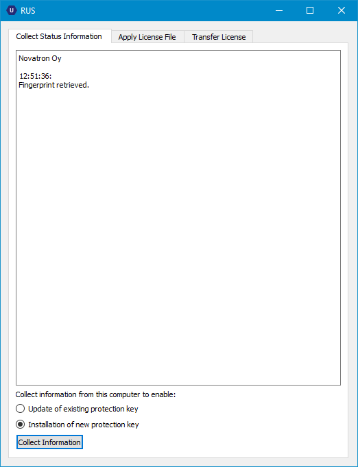 Kun teet asennuksen ensimmäisen kerran, aseta välilehdellä Collect Status Information alareunan valinta kohtaan Installation of new product key ja paina painiketta Collect information.