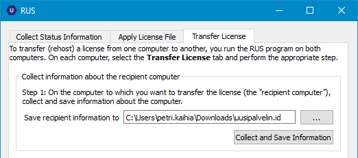 Tee välilehdellä Transfer License vastaanottavan koneen ID-tiedosto ja tallenna syntynyt tiedosto esimerkiksi muistitikulle tai verkkolevylle, josta sen voi siirtää sille koneelle, josta lisenssi siirretään. Anna ensin nimi ja polku, johon tiedosto tallennetaan, ja paina alapuolella Collect and Save Information.