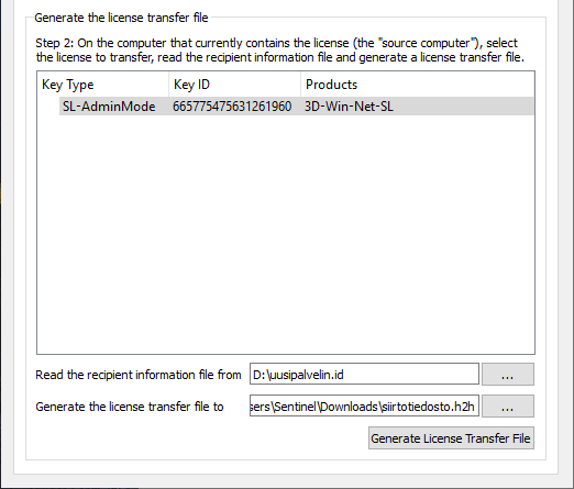 Anna kohtaan Generate the License polku ja nimi tiedostolle, . h2h ja paina *Generate License Transfer File painiketta.