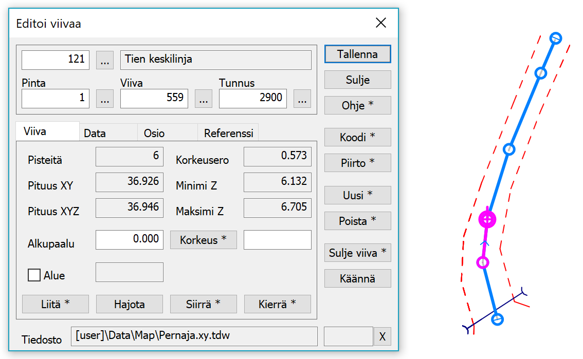Poista-painikkeella poistetaan koko viiva ja Käännä-painikkeella voidaan viivan kulkusuunta kääntää. Data-välehdellä näytetään viivan ominaisuudet ja se noudattaa yleisiä ominaisuuksien editointisääntöjä.