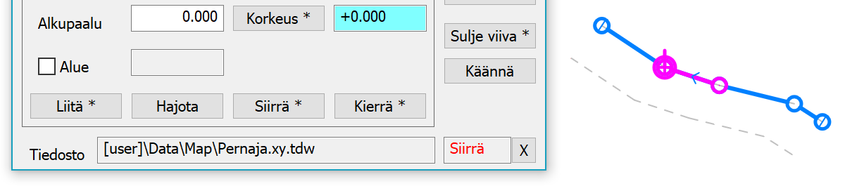 Siirrä-painikkeella voidaan siirtää koko viivaa. Painike käynnistää siirtotilan, jossa viiva siirtyy hiiren osoittamaan sijaintiin. Oletuksena viivan uusi sijainti annetaan suhteessa aktiivisen osion loppupisteeseen. Shift-näppäimen kanssa voidaan sijainti osoittaa suhteessa viivan referenssipisteeseen. Mikäli viivalla ei ole referenssipistettä, se lasketaan automaattisesti painopisteeseen. Alkuperäinen viiva näytetään harmaana siirron aikana ja Korkeus-kenttään voidaan antaa tarvittaessa siirron korkeusero. Siirto kuitataan tallentamalla viiva. Vastaavasti Kierrä-painikkeella voidaan viivaa kiertää joko aktiivisen osion loppupisteen tai referenssipisteen ympäri.