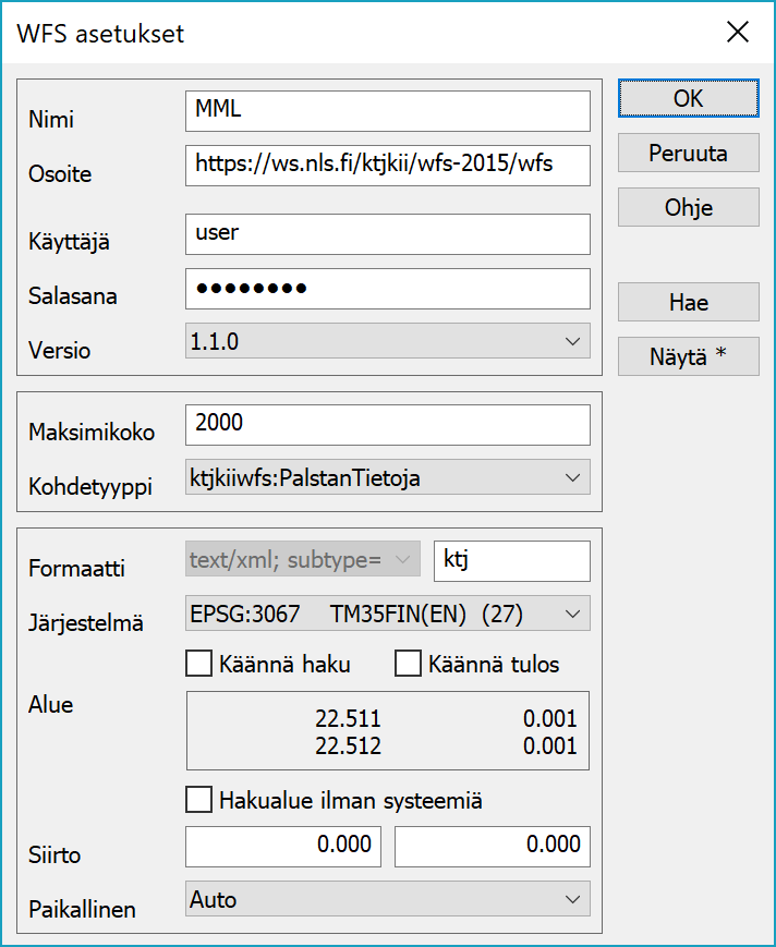 Kun yhteystiedot on syötetty, painetaan Hae-painiketta. Se hakee palvelusta kuvaustiedoston, joka sisältää tiedot palvelun tarjoamista karttatasoista ja koordinaatistoista. Lyhyt OK-viesti vilahtaa ruudulla haun onnistumisen merkiksi. Jos tietojen haku ei onnistu, tarkista URL-osoite sekä mahdolliset käyttäjätunnus ja salasana. Erityisesti pitää olla tarkkana osoitteen protokollan (http vs. https) kanssa.