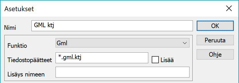 Yllä olevassa esimerkissä määriteltiin WFS-asetuksiin pääte ktj eli haetut tiedostot saavat automaattisesti päätteen .gml.ktj. Vastaavasti lisätään uusi GML-formaatinmuunnin ja laitetaan sen tiedostopäätteeksi *.gml.ktj. Tämän muuntimen asetuksiin voidaan sitten laittaa palvelukohtaisia määrittelyjä kuten esimerkiksi koodimuunnoksia.