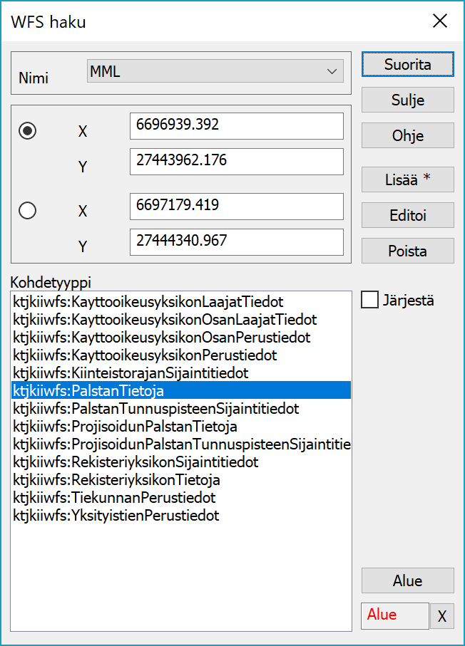 Kohdetyyppilistasta valitaan haluttu taso ja Suorita-painike tekee sitten hakupyynnön palvelimelle käyttäen osoitettua aluetta. Palvelimen palauttama tiedosto luetaan sen tiedostopäätteen mukaisella formaatinmuuntimella. Elementtilistassa tiedoston nimessä näkyy haun kellonaika ja tason nimi (esim. wfs_165639_PalstanTietoja.gml.ktj).
