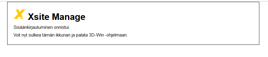 Jos kirjautuminen onnistuu, sinut ohjataan sivulle joka kertoo onnistumisesta ja kehottaa sulkemaan selaimen. Voit siirtyä takaisin 3D-Win ohjelmaan.