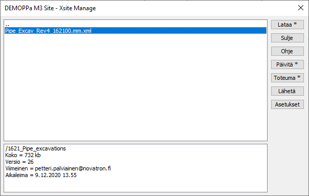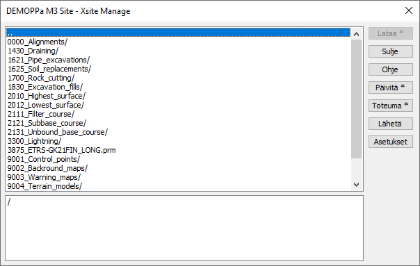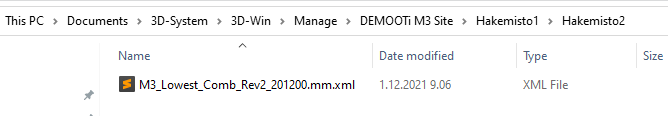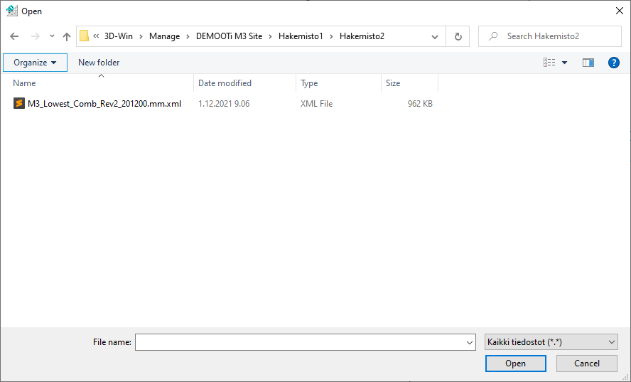 Tiedostot ladataan oletuksena käyttäjähakemiston alla sijaitsevaan Manage -hakemistoon. Esimerkiksi C:\Users\Käyttäjä\Documents\3D-System\3D-Win\Manage\Työmaa\Tiedosto.xml.